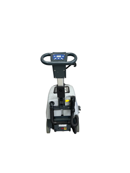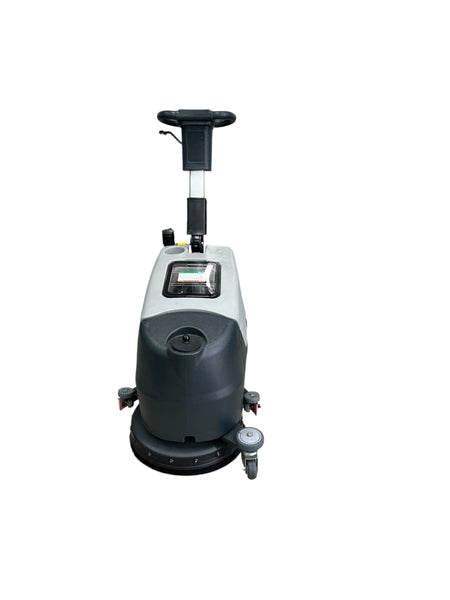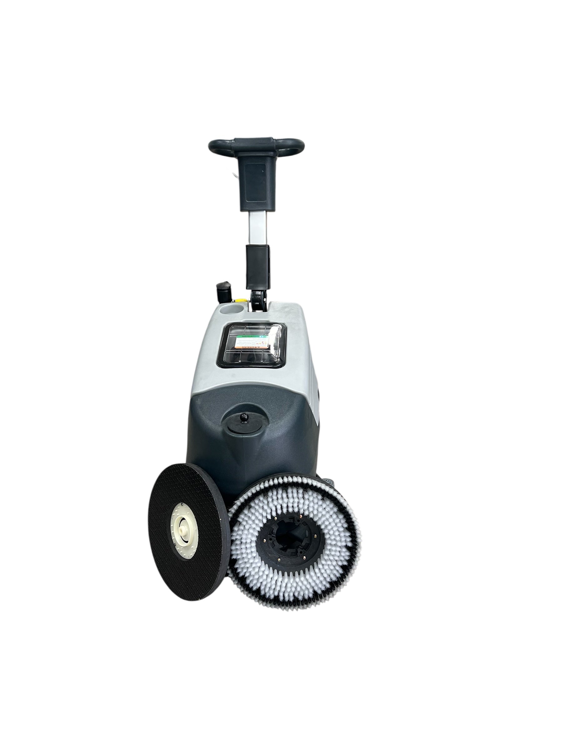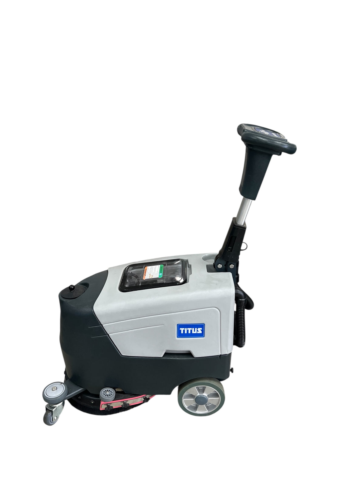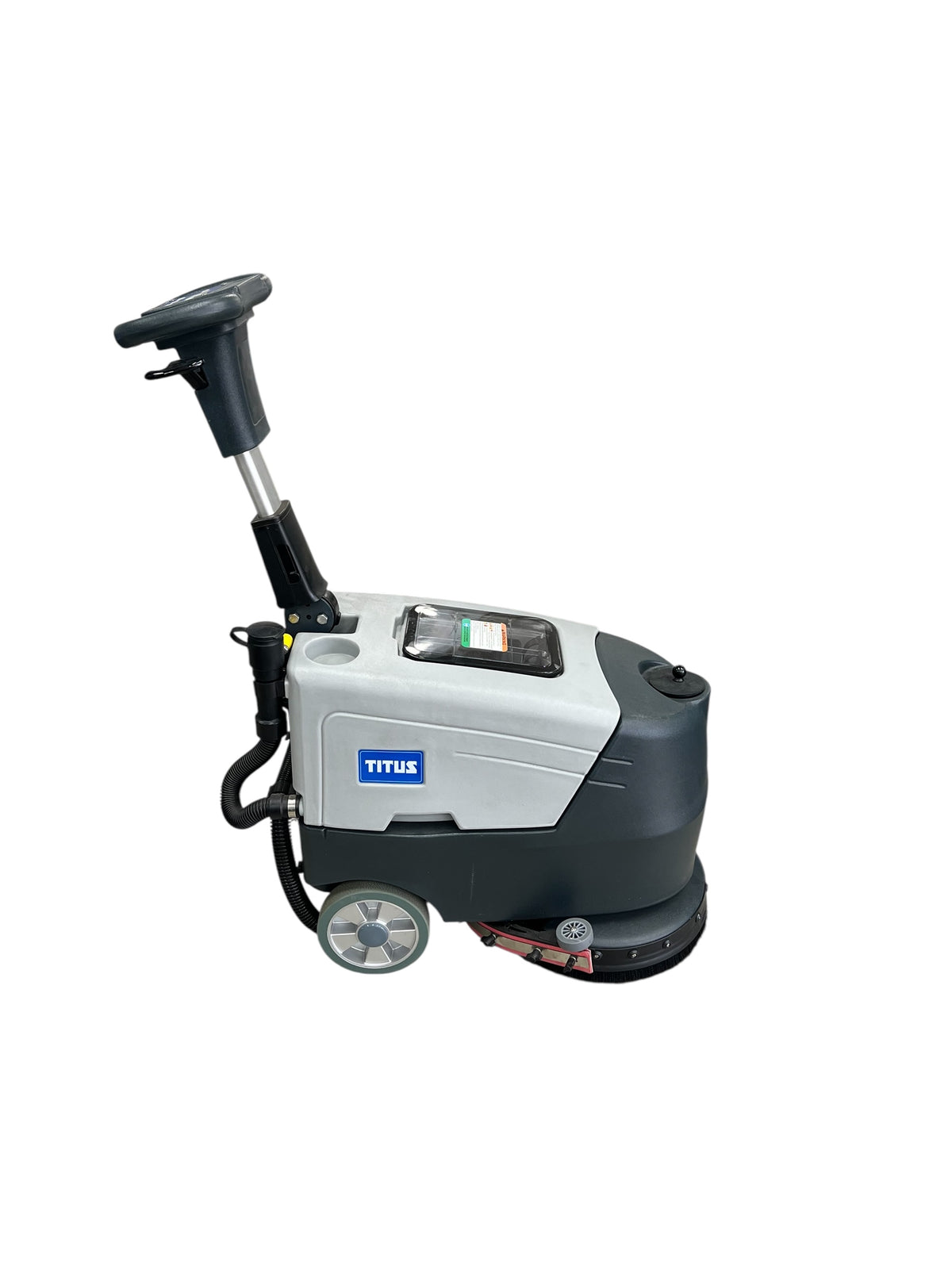 The T430B Titus Wide Mini, a battery-powered compact floor scrubber, is designed for efficiency and versatility in tight spaces. Featuring an intuitive LCD control panel and a handle that adjusts 180 degrees for optimal maneuverability, this scrubber adapts easily to varied cleaning environments. It includes four water level adjustments (0, 40%, 70%, 100%) to cater to different cleaning needs and an electric cable that enhances its range. The scrubber comes equipped with three interchangeable brushes for hard, medium, and soft surfaces, making it suitable for a wide range of floor types. Its compact design, combined with the adjustable handle and water flow, ensures thorough cleaning even in constrained areas, simplifying both loading and unloading processes.